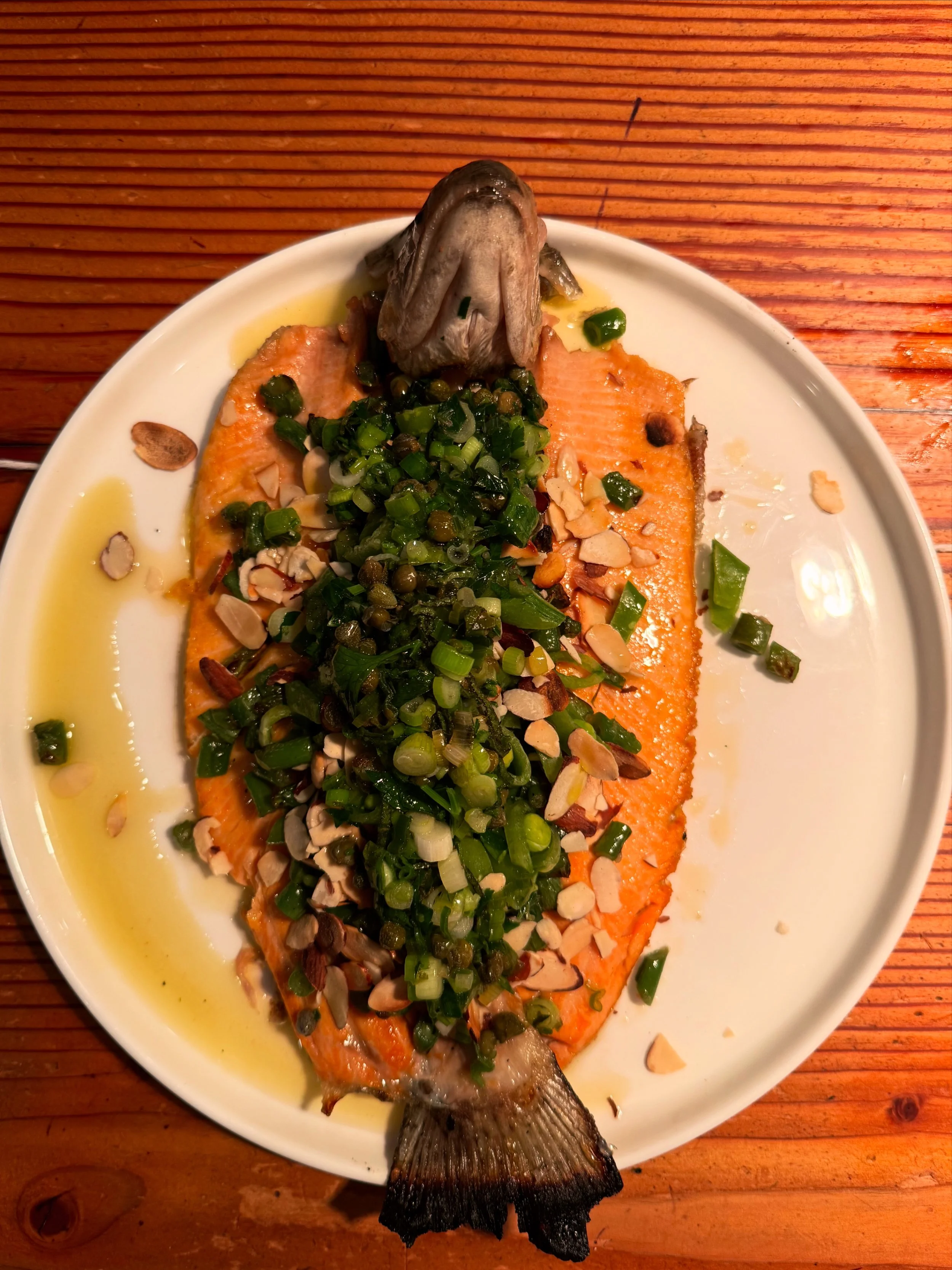 breaded 12oz pork chop, poached egg, lemon-caper brown butter, anchovy, krautsalat